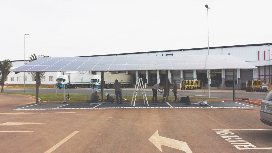 Estabelecimento: Honda Localização: Paulínia/SP, Brasil Início da Operação: Outubro/2013 Potência Nominal: 10,5 kWp Estrutura Utilizada: Fixação em aço galvanizado com acessórios em INOX compondo os eixos de sustentação de um estacionamento